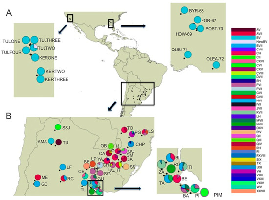 Geospatial distribution of combined genotypes of Naupactus cervinus for the Continental US (A) and the native range (B). Legend to the right lists all multilocus genotypes; pies indicate the relative presence of each multilocus genotype in each locality. Acronyms used for multilocus genotypes follow the nomenclature used by [19]. Localities are labeled according to codes in Table 1.