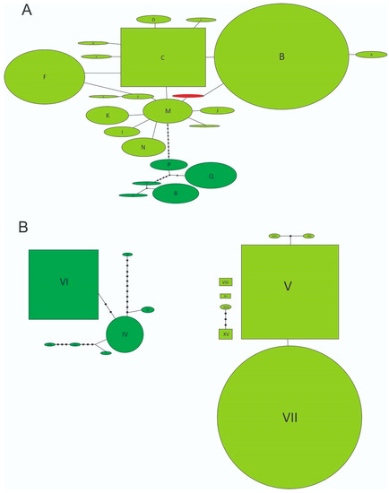By studying a sample of 71 individuals coming from 13 locations from three southern states from the US, namely California, Georgia, and Florida, we found only two multilocus genotypes. While most of the specimens showed the B-V genotype (COI-ITS1), only two individuals from Tulare Co., California (3%), had the Y-V combination (Table 1, Figure 1A), with Y being a closely related and novel haplotype for N. cervinus. Statistical parsimony networks show that both components of the multilocus genotype belong to the Grassland clade (Figure 2A,B) and that the novel Y mitochondrial sequence is, indeed, derived from B by a single synonymous mutation replacing a G with an A in a third codon position (Figure 2A, Accession number: ON682730). Two scenarios can be posed about the origin of this new variant: either it already occurred within the native range and was independently introduced to California or it was recently derived from B or M exclusively at this location.
