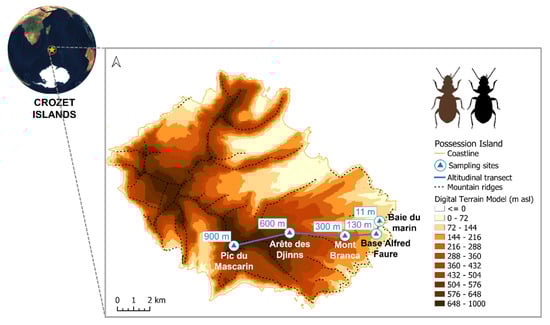 Amblystogenium pacificum Putzeys 1869 usually occupies a mesic fellfield habitat (i.e., rocky and stony mineral soils with relatively sparse vegetation) [40] and can occur along the whole altitudinal gradient of the island. Field sampling was conducted during the southern-hemispheric summer, between December 2017 and February 2018. Adult specimens of both morphotypes were easily observed and manually captured in the inter- and sub-stone spaces on the Crozet Islands. For this study, insects were hand-collected at five sites along an elevation gradient covering the full altitudinal range of Possession Island, i.e., from 0 to 900 m asl (Figure 1), following quotas imposed for the collection of endemic species from the sub-Antarctic Crozet Islands (Arrêté A-2017-113, 12 October 2017, Terres Australes et Antarctiques Françaises).