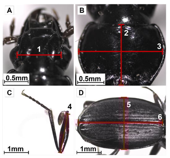 Morphometric measurements performed on adults of Amblystogenium pacificum. The illustrations were made on a male from the dark morphotype collected at 900 m asl. (A)—Head: interocular distance (1); (B)—Pronotum: length (2) and width (3); (C)—Left leg of the third pair of legs: length of the femur (4); (D)—Elytra: width (5) and length (6).