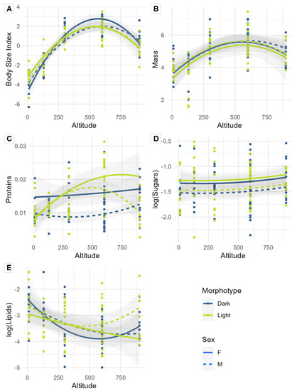 The protein and sugar amounts were both higher in females compared to males (Table 1C,D and Figure 3C,D). The protein contents were also higher, on average, for light morphotypes (Table 1C and Figure 3C). Body mass and lipid amounts were not affected by altitude, morphotype, or sex (Table 1B,E and Figure 3B,E), even though a trend was observed: there was a proportional change in body mass in relation to body size and a tendency for sugar amounts to evolve with a negative correlation to body size along the altitude gradient.