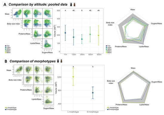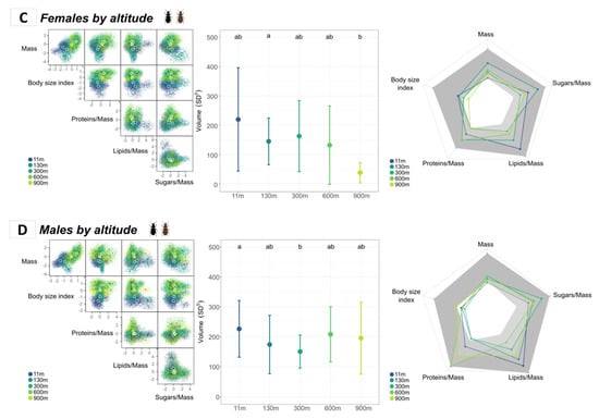 Larger hypervolume sizes are associated with broader trait ranges and higher functional richness (i.e., a higher niche space occupied by the species within a community), which in turn can suggest higher resilience of the local population of that altitude to environmental stress [8,14,66]. Here, the niche spaces occupied by beetles from most of the sampled sites had similar volumes, except for 11 m and 300 m asl, which differed from one another due to the high variation in the lipids/mass ratio at 11 m and the low proteins/mass ratio at 300 m. Apart from these two exceptions, the average variation in trait values was very similar within each site, indicating the absence of an overall pressure based on altitude, which would allow niche expansion or constraints for all traits simultaneously.