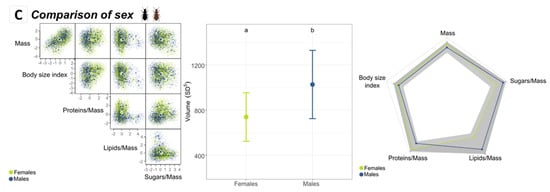 As for the contributions of individual traits to the hypervolumes, the only trait to significantly negatively impact the hypervolume size was, again, the body size index, especially for males (Figure 5C,D; right panels).