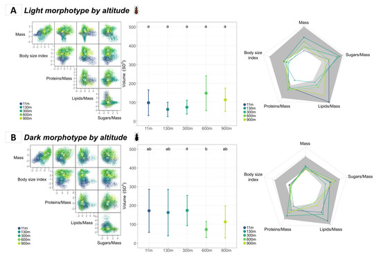 The significant interaction between altitude and morphotype (Table 1A) indicated that this pattern was stronger for dark morphotypes than for light ones (Figure 3A). The three-way interaction between altitude, morphotype, and sex was not significant and was not retained in the model selection process.