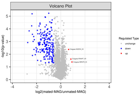 Volcano plot of the differentially abundant proteins (DAPs). The x-axis represents a log2 fold change (mated-male accessory gland (MAG)/unmated-MAG) and the y-axis represents a negative logarithm (log10 scale) of the p-value. Each dot represents a protein. Red dots indicate up-regulated proteins. Blue dots indicate down-regulated proteins. Grey dots represent proteins with non-significant differences (from Student’s t-test). The farther away from zero that the point is, the more significant the difference.