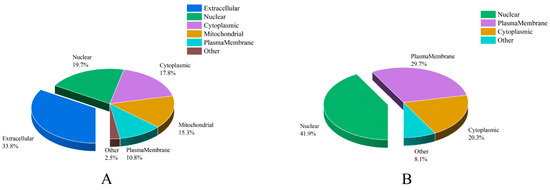 The distribution of subcellular localization of accessory gland proteins (ACPs) in Plutella xylostella. (A) the distribution of subcellular localization of the predicted secreted ACPs. (B) the distribution of subcellular localization of the unconfirmed ACPs.