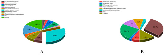 The distribution of functional categories of accessory gland proteins (ACPs) in Plutella xylostella. (A) functional category analysis of the predicted secreted ACPs. (B) functional category analysis of the unconfirmed ACPs.
