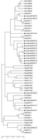 The phylogenetic analysis of seminal fluid trypsins among different insect species. The phylogenetic tree was constructed by the maximum likelihood method and the Jones–Taylor–Thornton (JTT) substitution model using deduced amino acid sequences of the conserved domains of seminal fluid trypsin. The phylogeny was tested with 1000 bootstrap replications using the bootstrap method. Sequences beginning with “Unigene” represent transcriptome unigene IDs of Plutella xylostella seminal fluid trypsins, indicated by the black triangle. Sequences beginning with “FBpp” represent IDs of Drosophila melanogaster seminal fluid trypsins (http://flybase.org/, accessed on 23 January 2023). Sequences beginning with “AAEL” represent IDs of Aedes aegypti seminal fluid trypsins (http://www.vectorbase.org/, accessed on 23 January 2023). Sequences beginning with “XP” represent IDs of Apis mellifera seminal fluid trypsins (http://www.ncbi.nlm.nih.gov/, accessed on 23 January 2023). Sequences beginning with “HM” represent IDs of Heliconius erato and H. melpomene seminal fluid trypsins (http://www.ncbi.nlm.nih.gov/, accessed on 23 January 2023).