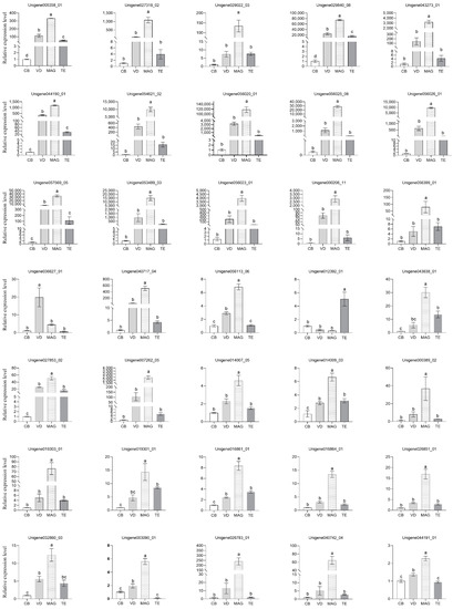To confirm the proteomic results, we further determined the transcriptional expression profiles of 35 genes in virgin males’ TE, VD, and MAG, as well as the virgin females’ CB, through qRT-PCR. In total, 33 genes showed strong expression in the MAG of P. xylostella (Figure 6). Of these 33 genes, 7 trypsins were expressed at levels tens to hundreds of thousands of times greater in the MAG than in the CB tissue. Two exceptional genes were observed: one was trehalase (Unigene 036627_01), which showed a high expression in the VD, and the other was a ecdysteroid-regulated 16 kDa protein (Unigene 012392_01), which showed a high expression in the TE. The gene expression profiles from qRT-PCR were corroborated with our proteomic data.