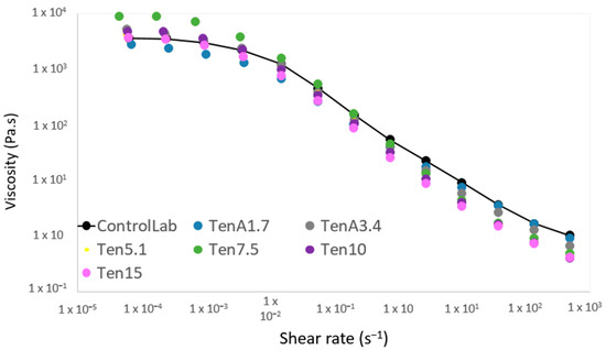 Variation of apparent viscosity (η) as a function of shear rate () of TenA1.7, TenA3.4, Ten5.1, Ten7.5, Ten10, Ten15 and Commercial Standard (ControlLab).