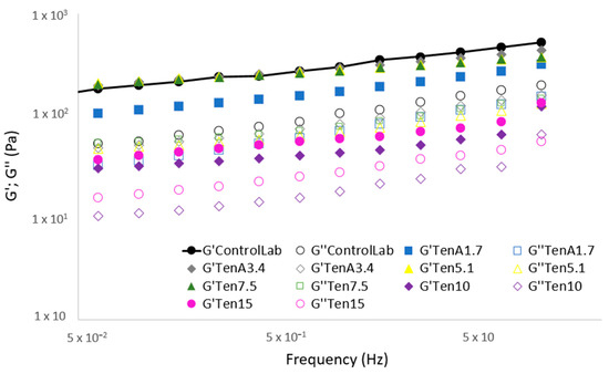 Mechanical spectra of the emulsions (ControlLab, TenA1.7, TenA3.4, Ten5.1, Ten7.5, Ten10 and Ten15); G’ (elastic component—filled symbol), G ′′ (viscous component—open symbol).