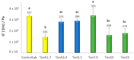 G’(1 Hz) of the emulsions (ControlLab, TenA1.7, TenA3.4, Ten5.1, Ten7.5, Ten10 and Ten15). The different lowercase letters (a, b and c) located above each bar represent the significant difference between formulations (p < 0.05), according to the ANOVA calculation.