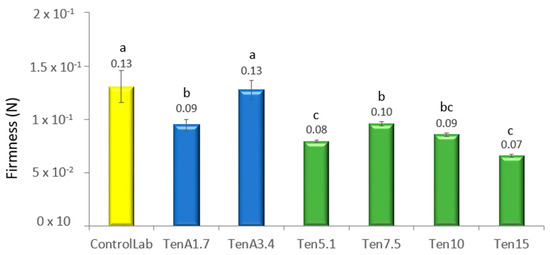 Firmness of the different emulsions: gray—standard, blue—samples without egg, but with starch, green—samples without egg and starch. The different lower-case letters (a, b, c and d) located above each bar represent the significant difference between the formulations (p ≤ 0.05), according to the ANOVA calculation.
