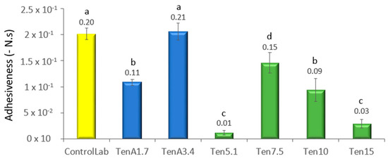 Adhesiveness of the different emulsions (-N.s): gray—standard, blue—samples without egg, but with starch, green—samples without egg and starch. The different lower case letters (a, b, c and d) located above each bar represent the significant difference between the formulations (p ≤ 0.05), according to the ANOVA calculation.