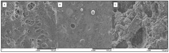 SEM micrographs of emulsified sauces: ControlLab (A). TenA3.4 (B). and Ten7.5 (C). Magnification of 600×.