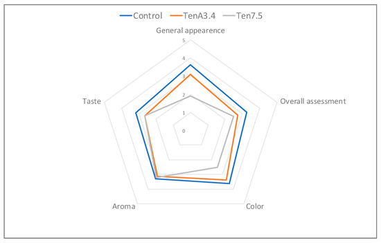A sensory evaluation of sauces containing 3.4% and 7.5% T. molitor flour and the commercial standard (ControlLab) was carried out. The samples with a physical behavior (G’, 1 Hz—Figure 3 and texture—Figure 4) more similar to the control sauce were selected. The mean scores of the five sensory parameters considered were plotted (Figure 7). The Ten7.5 sample was the least appealing to the consumer, with a score of 1.91 for “General appearance”, compared to 3.11 for TenA3.4. and 3.62 for ControlLab. The impact of insect flour in the sauce color should be the main reason for this evaluation. In terms of color attribute, Ten7.5 sample also had a lower score (2.51) compared to the ControlLab (3.62) and TenA3.4 (3.36) samples. The attribute “taste” should also reinforce the negative in terms of the general appearance: rated better in the control sample (3.17) than in TenA3.4 and Ten7.5 (scores of 2.67 and 2.64 respectively). The negative impact of T. molitor at high concentrations was also identified by Djouadi et al. (2022) [22], in the case of crackers.