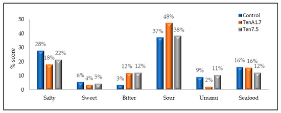 Between 37% and 48% of tasters considered that the ControlLab TenA3.4 and Ten7.5 samples tasted “sour”. This should be improved, as sour taste is negatively correlated to product acceptance [51]. Between 18% and 28% of the tasters identified a “salty” taste on the samples. Finally, 16% of the tasters considered that the samples had a sea-flavor, except for Ten7.5, with only 12% of consumers identifying this aroma.