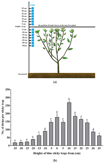 - Bian, L.; Yang, P.X.; Yao, Y.J.; Luo, Z.X.; Cai, X.M.; Chen, Z.M. Effect of trap color, height, and orientation on the capture of yellow and stick tea thrips (Thysanoptera: Thripidae) and nontarget insects in tea gardens. J. Econ. Entomol. 2016, 109, 1241–1248. [Google Scholar] [CrossRef]