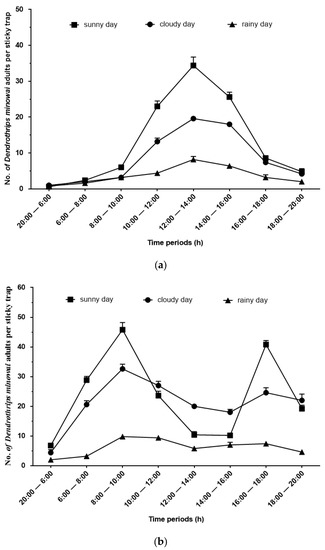- Aliakbarpour, H.; Che Salmah, M.R. Diurnal activity of four species of thrips (Thysanoptera: Thripidae) and efficiencies of three nondestructive sampling techniques for thrips in mango inflorescences. J. Econ. Entomol. 2010, 103, 631–640. [Google Scholar] [CrossRef]