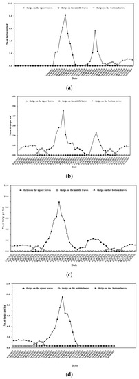 - Fu, B.L.; Xia, X.Y.; Qiu, H.Y.; Li, Q.; Tang, L.D.; Zhang, X.; Zeng, D.Q.; Liu, K. Population activities, occurrence dynamics, and spatial distribution pattern of Thrips hawaiiensis in banana orchards. Acta Ecol. Sin. 2019, 39, 4996–5004. (In Chinese) [Google Scholar]