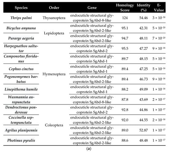 - Karouzou, M.V.; Spyropoulos, Y.; Iconomidou, V.A.; Cornman, R.S.; Hamodrakas, S.; Willis, J.H. Drosophila cuticular proteins with the R&R consensus: Annotation and classification with a new tool for discriminating RR-1 and RR-2 sequences. Insect Biochem. Mol. Biol. 2007, 37, 754–760. [Google Scholar]