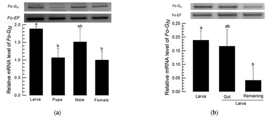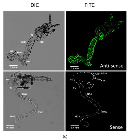 Figure 2a indicates substantial Fo-GN expression occurs in larvae, with lower expression in pupae. Within larvae, we recorded substantial expression in whole larvae and in isolated larval alimentary canals and significantly diminished expression in the remaining gut-free larval tissues (Figure 2b). FISH analysis using FAM-labeled probes shows Fo-GN expression occurred in the midgut and salivary gland with the anti-sense probe, but not with the sense probe (Figure 2c).