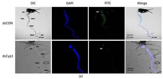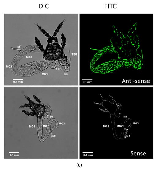 Expression profile of Fo-Cyp1. (a) Fo-Cyp1 expression in the indicated developmental stages. (b) Fo-Cyp1 expression in larvae, larval gut tissue, and remaining gut-removed tissues. An elongation factor, EF1, was used to normalize the expression level. Different letters above the standard deviation bars indicate significant differences among means at Type I error = 0.05 (LSD test). (c) FISH assays show Fo-Cyp1 expression (green) in the F. occidentalis larval gut using an anti-sense probe. In sense probe treatment, the contour is drawn because of no signal. The samples were prepared as described in the Section 2. FG, foregut; SG, salivary glands; MG, midgut; HG, hindgut and MT, Malpighian tubules. All scale bars represent 0.1 mm. Cyp1, cyclophilin 1.