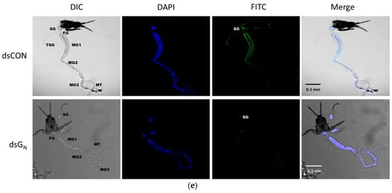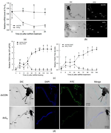 Larvae were treated with RNAi as described in the Section 2 and Fo-GN expression was significantly reduced over the following 24 h (Figure 3a). Fo-GN expression was not detectable in the midgut or salivary gland by FISH analysis (Figure 3b). RT-qPCR and ELISA analysis confirmed that TSWV multiplication in the midgut and salivary gland was reduced in the absence of the glycoprotein gene (Figure 3c). The immunofluorescence assay shows the larval stage TSWV signal did not appear in the alimentary canals of RNAi-treated larvae (Figure 3d). These treated larvae developed to adults and TSWV-associated staining was assessed (Figure 3e). In control adults, the TSWV signal was clear in the salivary gland and midgut. However, little was observed in the adults of the RNAi treatment.