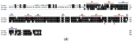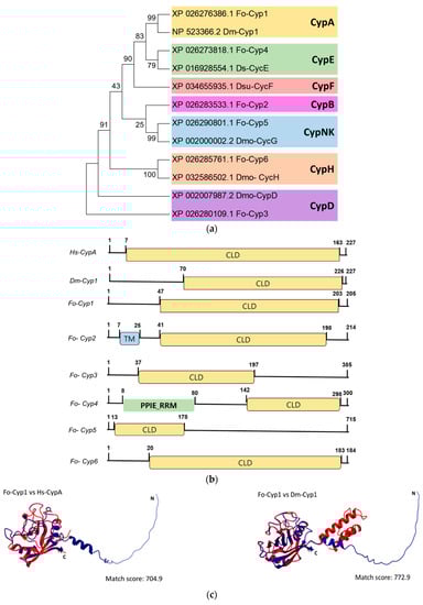 Molecular characterization of the F. occidentalis cyclophilin genes. (a) Phylogenetic analysis between selected cyclophilin genes present in fruit flies (Drosophila spp.) and WFTs (F. occidentalis) and compared with cyclophilin genes present in humans (Homo sapiens). The phylogenetic tree was generated by the Neighbor-joining method using MEGA6.0. Bootstrapping values were obtained with 1000 repetitions to support branch and clustering. Amino acid sequences were retrieved from GenBank. Gene accession numbers are shown in the figure. (b) Functional domain analysis and comparison of six cyclophilin genes present in F. occidentalis, the Drosophila melanogaster cyclophilin 1, and the Homo sapiens cyclophilin A. The predicted domain included “CLD” for the cyclophilin-like domain, “TM” for the transmembrane, and “PPIE_RRM” for the RNA recognition motif. Domains were predicted using EMBL-EBI (www.ebi.ac.uk accessed on 29 November 2022) and Pfam (http://pfam.xfam.org accessed on 29 November 2022). Transmembrane domains were predicted using DeepTMHMM (https://dtu.biolib.com/DeepTMHMM, accessed on 29 November 2022). (c) 3D structural analysis between F. occidentalis (blue) and Homo sapiens (red) cyclophilin, where the match score is 704.9 and F. occidentalis (blue) and Drosophila melanogaster (red) cyclophilin, where the match score is 772.9. Three-dimensional structure and superimposition analysis were performed by UCSF Chimera (http://www.cgl.ucsf.edu/chimera, accessed on 29 November 2022). (d) Possible cyclosporin binding site in the Fo-Cyp1 structure and amino acid sequence alignment of Fo-Cyp1, Dm-Cyp1, and Hs-CypA. The alignment was generated by the MegAlign multiple sequence alignment program using the ClustalW program. Conserved amino acid sequences show two α helices (blue bar) and eight β-barrel structure (red bar) for F. occidentalis, D. melanogaster, and H. sapiens.