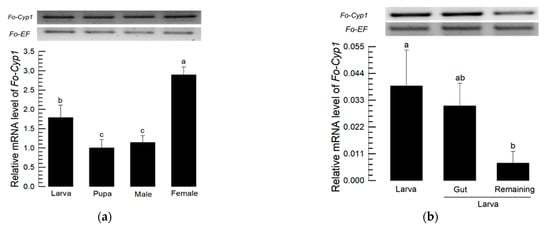 mRNA expression analysis of the indicated developmental stages show that Fo-Cyp1 is expressed at significantly higher levels in females compared to larvae, pupae and males (Figure 5a). Within the larval stage, mRNA expression was significantly higher in whole larvae than in the gut-removed remaining tissues. There were no significant expression differences between whole larvae and the isolated gut (Figure 5b). FISH analysis shows Fo-Cyp1 expression in the midgut and salivary gland. Fo-Cyp1 expression was detected in the midgut and salivary gland with the anti-sense probe, but not with the sense probe (Figure 5c).