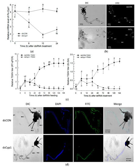 After feeding on a dsRNA suspension, Fo-Cyp1 gene expression was monitored at 0, 6, 12 and 24 h post treatment. At 12 h post feeding, Fo-Cyp1 expression was substantially reduced by approximately 2.5-fold (Figure 6a). After dsCyp1 application, cyclophilin expression was undetectable in midgut and salivary gland with the anti-sense, nor with the sense probes (Figure 6b). To determine whether the TSWV multiplication is related to Fo-Cyp1 in the midgut and salivary gland, dsRNA fed larvae were treated again with TSWV. RT-qPCR and ELISA data show that TSWV multiplication was reduced to near zero by 72 h post RNAi treatment (Figure 6c). Similarly, Figure 6d,e show the RNAi treatments led to very large reductions in immunofluorescence in larvae and adults.