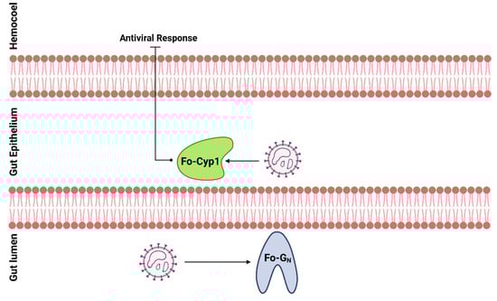 These results indicate that Fo-GN and Fo-Cyp1 are required for the circulative-propagative transmission of TSWV by the vector F. occidentals. This suggests to us that TSWV coat proteins interact with Fo-GN on the gut of F. occidentalis larvae (Figure 7) because young larvae of F. occidentalis should be infected with the virus to transmit TSWV [6,31]. The viral GN and Fo-GN interaction may be associated with viral internalization in the epithelial cells. Within the cells, TSWV interacts with Fo-Cyp1 to suppress anti-viral responses to protect and multiply the viral particles. After the viral replication, TSWV particles accumulate in the principal salivary gland, especially in adults for viral transmission via feeding behavior [9]. Thus, the infection of TSWV to the larval midgut via Fo-GN and Fo-Cyp1 is essential for TSWV dissemination.