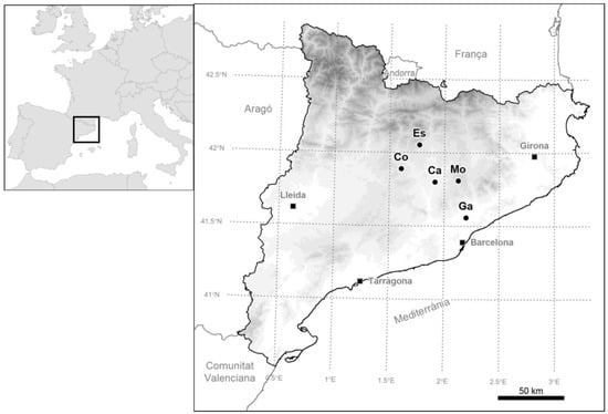 Study areas (circles): Cabrianes (Ca), Cardona (Co), l’Espunyola (Es), Gallecs (Ga) and Moià (Mo). Gray shading indicates elevation every 500 m.