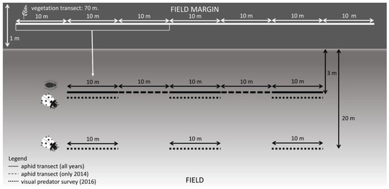 We established a 70-m transect centered on the aphid-sampling transect along the margin adjacent to the field edge. This ‘vegetation transect’ was divided into 10-m segments, in which we visually assessed the total vegetation cover and the relative cover per species using the Braun-Blanquet scale. To ensure standardized vegetation surveys, we only considered the vegetation in the 1-m-wide strip nearest to the field edge.