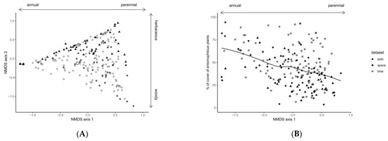 Even though we initially intended to include entomophily in our models, we detected significant correlation with the first component of the vegetation NMDS (Spearman’s correlation coefficient: −0.374, p < 0.001; see Figure 3B). Entomophily was therefore excluded from linear models and only used to explain our results.