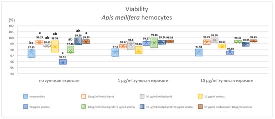 Effect of pesticide exposure on honeybee hemocyte viability after 18 h of exposure. Three groups of immune activation by zymosan A were exposed to different pesticides in single exposures or combinations. Results are expressed in percentages and different letters indicate the significant differences within zymosan groups (p < 0.05, n = 3).
