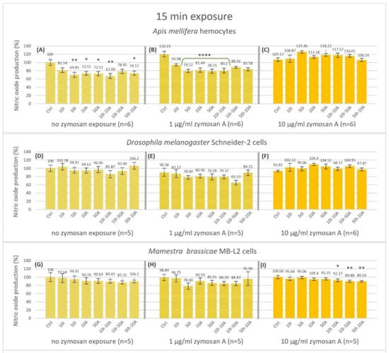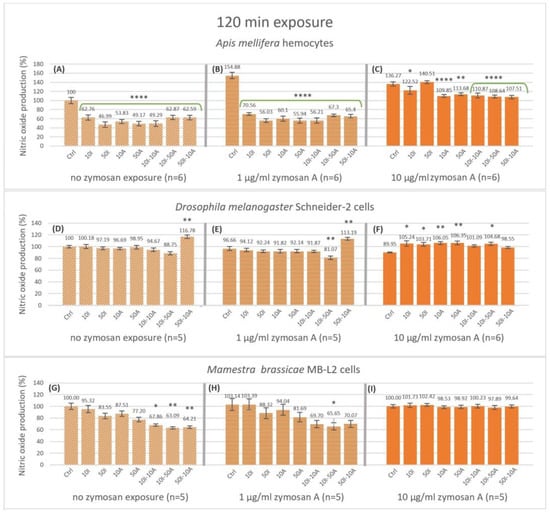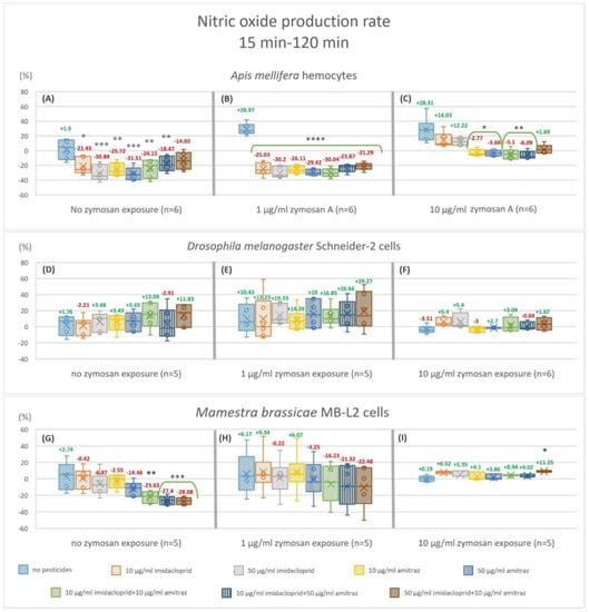 Nitric oxide production fold changes from 15 min to 120 min of exposure. The box plots represent the ratio of relative nitric oxide percentage of endpoint fluorescence measurements at 120 min over 15 min in hemocytes of Apis mellifera (A−C), Schneider-2 cells (D−F), and MB-L2 cells (G−I). All results were normalized to the no treatment control (A). Statistical analysis was carried out within zymosan A treatment groups. Significant differences within zymosan treatment groups relative to the respective controls are designated by an asterisk (* p < 0.05 and ** p < 0.01, *** p < 0.001 **** p < 0.0001, n = 5 or 6).