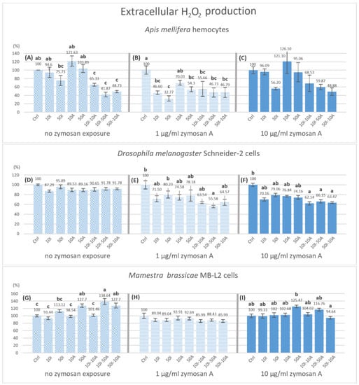 Hydrogen peroxide production by hemocytes after 3 h of pesticide exposure with different levels of immune stimulation. Bar graphs represent the relative hydrogen peroxide concentration produced hemocytes of Apis mellifera (A−C), Schneider-2 cells (D−F), and MB-L2 cells (G−I) after 3 h of exposure to pesticides. All concentrations are expressed in µg/mL of imidacloprid (I) or amitraz (A) in legends. Statistical analysis was carried out with in zymosan A treatment groups. ANOVA (Tukey HSD) or Kruskal–Wallis were used to test for significant differences at p < 0.05 with n = 5. Different letters signify significant differences. The absence of indication refers to no significant differences. Error bars represent standard errors.