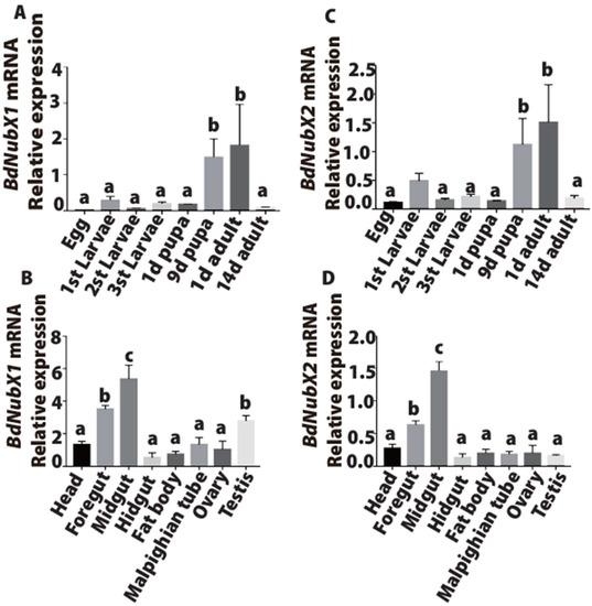 Expression profiles of BdNubX1 and BdNubX2. (A): BdNubX1 Expression profile of different development stages, 20 different stage of development samples per biological replicate, three biological replicates. (B): BdNubX1 expression profile of different adult tissues, 30 different tissue samples per biological replicate, three biological replicates. (C): BdNubX2 Expression profile of different development stages, 20 different stage of development samples per biological replicate, three biological replicates. (D): BdNubX2 expression profile of different tissues of adults. Different letters indicate statistically significant differences in BdNub isoforms expression, 30 different tissue samples per biological replicate, three biological replicates. p < 0.05, Tukey’s test, One way ANOVA.