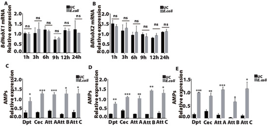 The immune response of BdNub after E. coli systemic infection. (A) The relative expression level of BdNubX1 after E. coli systemic infection. (B) The relative expression level of BdNubX2 after E. coli systemic infection. (C–E) The relative expression of AMPs genes at 3 h, 6 h, 12 h after E. coli systemic infection, respectively, (A–E) 30 flies samples per biological replicate, three biological replicates. Gene expressions were normalized to the reference gene RP49. UC: unchallenged flies. * p < 0.05, ** p < 0.01, *** p < 0.001, Student’s t-test.