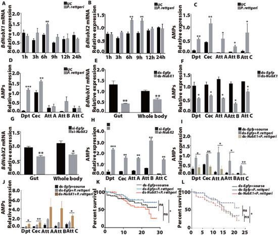 The immune response of BdNub after P. rettgeri oral infection. (A,B) The relative expression level of BdNubX1 and BdNubX2 after P. rettgeri oral infection. (C,D) The relative expression of the AMPs genes at 6h and 9h after oral infection, respectively. (E) The RNAi effect of BdNubX1 dsRNA injection. (F) The expression levels of AMPs genes in BdNubX1 RNAi flies. (G) The RNAi effect of BdNubX1 siRNA injection. (H) The expression levels of AMPs genes in BdNubX2 RNAi flies. (I,J) The AMPs genes expressions at 6 h after P. rettgeri oral infection in BdNubX1 RNAi flies (I) and BdNubX2 RNAi flies (J). dsEgfp treated group was used as the control for RNAi. (K,L) The survival of BdNubX1 RNAi and BdNubX2 RNAi flies after rate after P. rettgeri oral infection. (A–L) 30 flies samples per biological replicate, three biological replicates. * p < 0.05, ** p < 0.01, *** p < 0.001, Student’s t-test. For survival assay, ns, non-significance, Log-rank (Mantel-Cox) test.