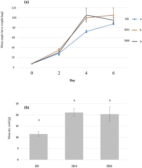 The growth and the final dry yield of black soldier fly larvae (BSFL) grown on substrates that contain different ratios of hemp material. BSFL were grown on substrates with 0% hemp (H0), 44% hemp (H44), 66% hemp (H66). The means and standard deviations of (a) the single-larva fresh weight over time and (b) the final dry yield are shown in the graph. Repeated measures ANOVA, and one-way ANOVA followed by Tukey’s test revealed significant differences in the larval growth over time (n = 5, p < 0.001, F = 26.8) and final dry yield (n = 5, p < 0.001, F = 28.5), respectively. Significant groups are indicated by the different letters.