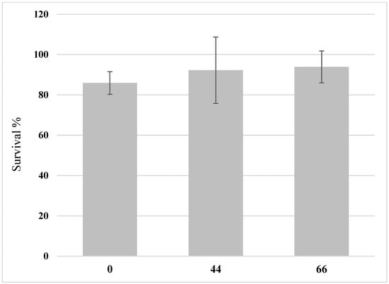 The survival of black soldier fly larvae (BSFL) grown on substrates that contain different ratios of hemp material. BSFL were grown on substrates with 0% hemp (H0), 44% hemp (H44), or 66% hemp (H66). The survival rate is shown in the graph with the standard deviations. One-way ANOVA (n = 5, p < 0.05) revealed no significant differences in survival between the treatments.