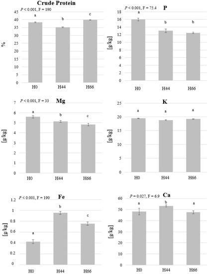 The mass fraction of protein, P, Mg, K, Fe, and Ca in dry black soldier fly larvae (BSFL) grown on substrates that contain different ratios of hemp material. BSFL were grown on substrates with 0% hemp (H0), 44% hemp (H44), or 66% hemp (H66). Shown are the means and the standard deviations of the measured mass fractions. One-way ANOVA (n = 3, p < 0.05) revealed significant differences between the treatments and the significant groups are represented by different letters.