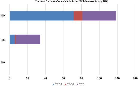 The mass fraction of cannabinoids in dry black soldier fly larvae (BSFL). BSFL were grown on substrates with 0% hemp (H0), 44% hemp (H44), or 66% hemp (H66). Shown is the mean cannabinoid mass fraction. The Student’s t test (n = 5, p < 0.05) revealed significant differences in the mass fraction of cannabidiolic acid (CBDA), cannabigerolic acid (CBGA), and cannabidiol (CBD). Only traces of CBC, CBCA, ∆9-THC, and THCA were detected in some samples.