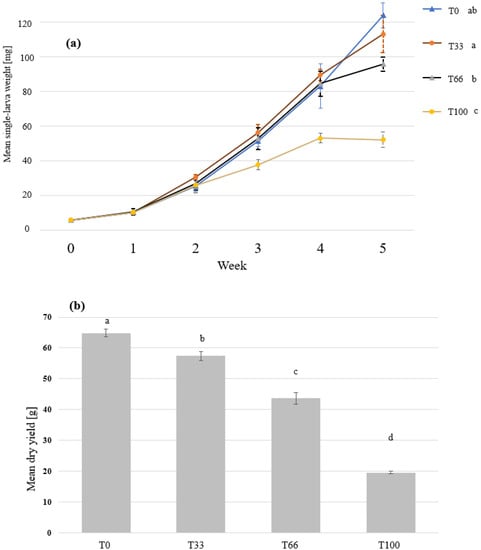 The growth and the final dry yield of mealworm larvae grown on substrates that contain different ratios of hemp material. Mealworm larvae were fed with wheat bran (T0), 67% bran and 33% hemp (T33), 34% bran and 66 hemp (T66), or 100% hemp (T100). The means and standard deviations of (a) the single-larva fresh weight over time and (b) the final dry yield are shown in the graph. Repeated measures ANOVA with Greenhouse–Geisser correction (n = 5, p < 0.001, F = 1531.7), and Kruskal-Wallis test (n = 5, p < 0.001) revealed significant differences in the larvae growth and final dry yield, respectively. Significant groups are indicated by the different letters.