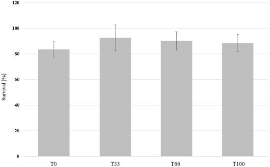 The survival of mealworm larvae grown on substrates that contain different ratios of hemp material. Mealworm larvae were fed with wheat bran (T0), 67% bran and 33% hemp (T33), 34% bran and 66 hemp (T66), or 100% hemp (T100). The survival rate is shown in the graph. One-way ANOVA (n = 5, p < 0.05) revealed no significant differences in survival among the treatments.