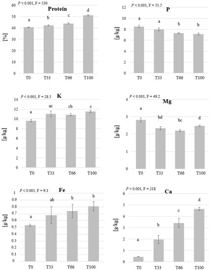 In contrast to the BSFL, no accumulation of the analysed elements was observed in the MW larvae biomass except for P (Figure 7). The values of P were higher in the treatments that contained higher proportion of wheat bran (T0 and T33), which also had higher P mass fraction in the initial substrate (Table 3). Crude protein was the highest in the larvae fed on the hemp material (51.2%) and decreased with the decreasing the hemp content. A relation between the mass fractions of elements in the initial substrate and the larvae was observed in K, Ca, and Fe and the values differed significantly among the treatments. The mass fraction of Mg was the highest in the larvae fed with bran (T0) (2.81 g/kg dry biomass), which had the highest Mg values in the initial substrate.