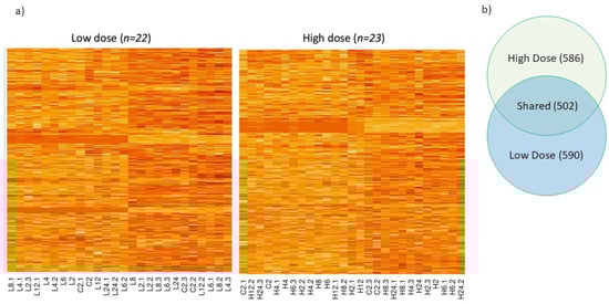 (a) Heat map depicting transcript abundance in the boll weevil across a 24 h time course (0, 2, 4, 6, 8, 12, and 24 h) following exposure to a low and high concentration of malathion. The color scheme indicates the gradient from high to low transcript abundance, where dark red coloring indicates the most transcripts and light yellow indicates the least while rows represent genes and columns represent individuals at time points. (b) Venn diagram of shared and unique genes in the low and high concentration treatment. The high concentration had a total of 1088 genes that changed significantly over the time series and 1092 in the low concentration. There were 502 genes shared between the low and high concentration.