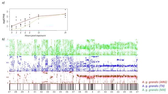 (a) Acetylcholinesterase (AChE) gene expression (log transformed counts per million) in the boll weevil over 24 h. The yellow line indicates the transcriptomic response to the low concentration treatment and the red line indicates the high concentration treatment. Closed circles represent gene expression values for individual weevils exposed to the high concentration of malathion, and open circles are weevils exposed to the low concentration. (b) Schematic of the 4 MB region on Chromosome 8 flanking the AChE gene. Gray bars indicate 88 annotated genes. The AChE gene is in the center. Colored dots represent 22,221 SNPs among the three weevil populations. Anthonomus grandis grandis population from Argentina is shown in red, Texas population in blue, and Mexico population in green. The y-axis for each of the colored sections is minor allele frequency where a frequency of one indicates fixation of the minor allele.